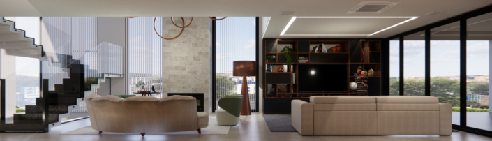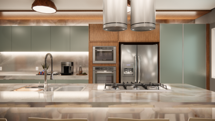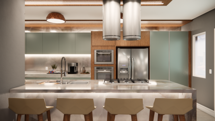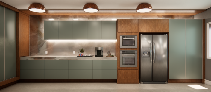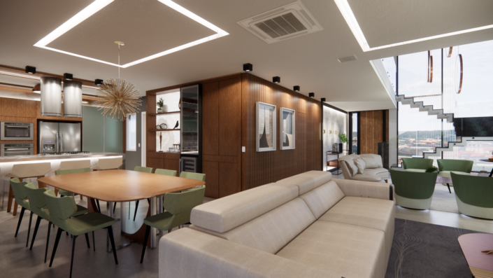 Um living amplo, funcional e atemporal! Painéis amadeirados percorrem todos os espaços integrando o ambiente. O verde dos estofados e dos móveis da cozinha traz delicadeza e cor a este ambiente projetado com muito carinho.