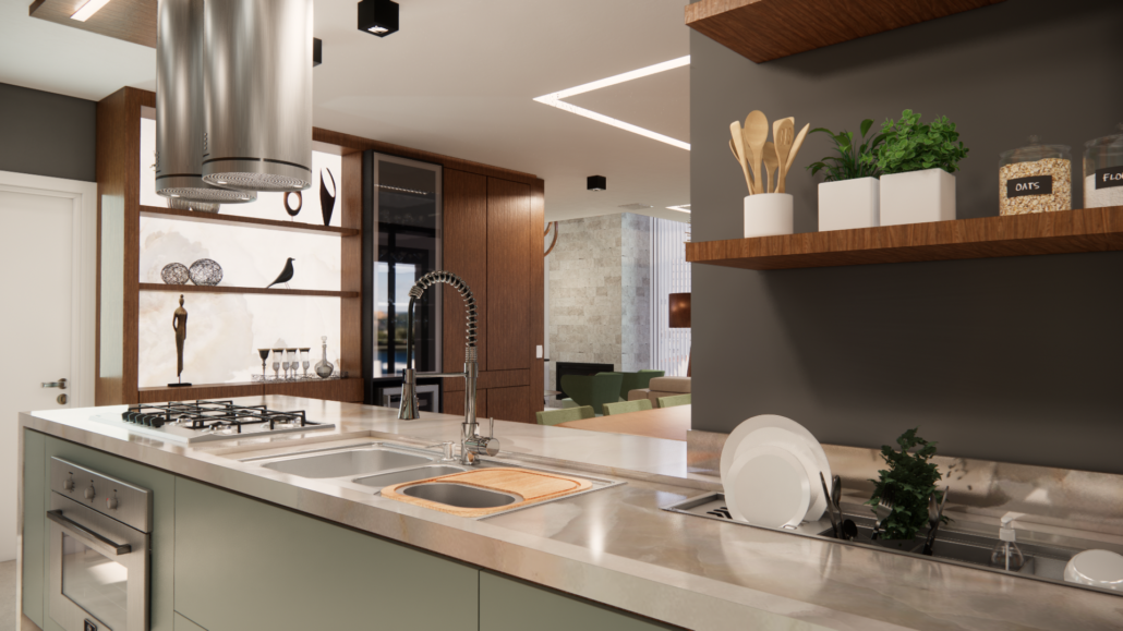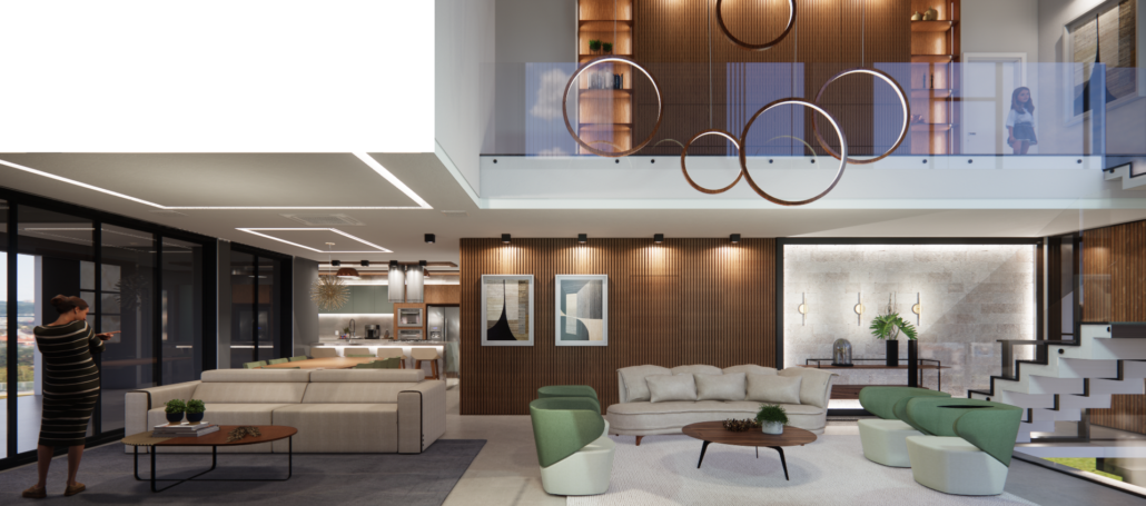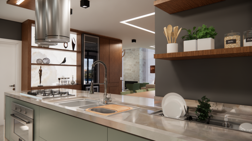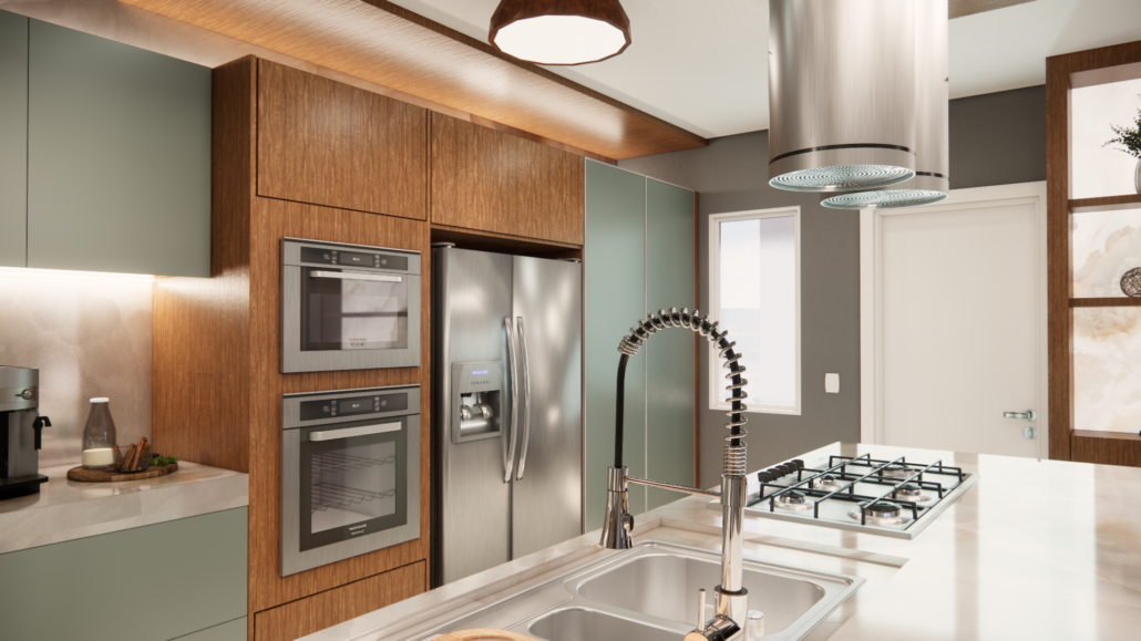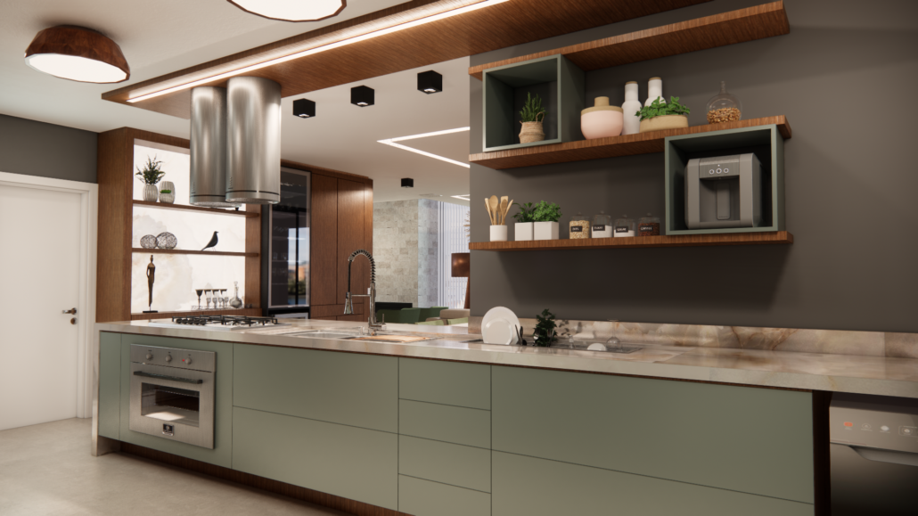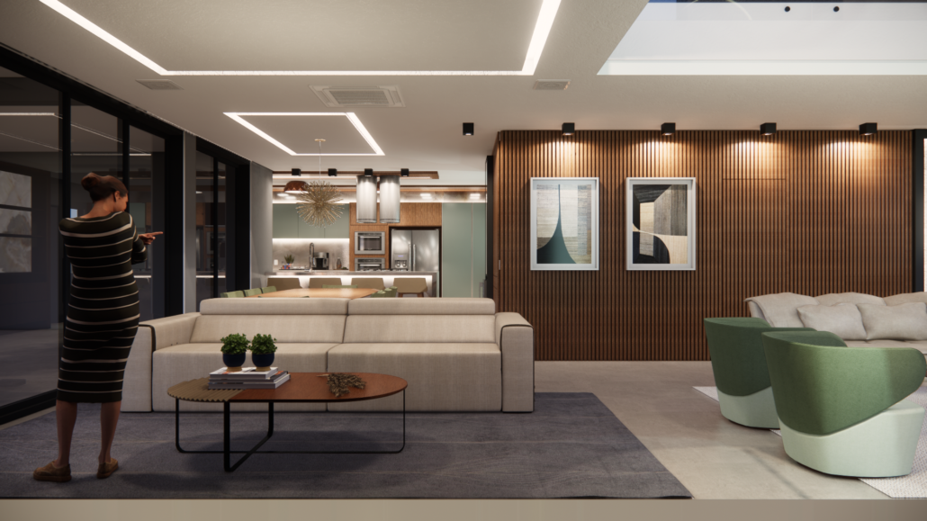 Um living amplo, funcional e atemporal! Painéis amadeirados percorrem todos os espaços integrando o ambiente. O verde dos estofados e dos móveis da cozinha traz delicadeza e cor a este ambiente projetado com muito carinho.